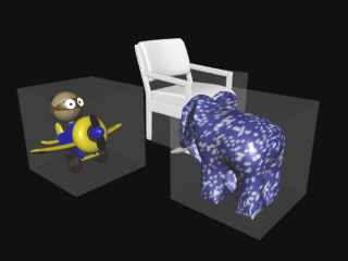 Example 1 - setting a surface colorIn this example the slim predefined variable "$pct" is used to set a (grayscale) color based on the sine function. Because the sine function generates values from -1 to 1 the abs() function is used to ensure positive values are assigned to the RIB "Color" statement. [ set 2PI 6.282 set cycles 3.0 set comp [expr abs(sin($pct * $2PI * $cycles))] return "Color $comp $comp $comp" ] Example 2 - setting a randomized rotationIn general when we use a function such as rand() what we require is not just random values but repeatable random values. Without performing steps 1 and 2 we would obtain a visually hopeless result because the rotational axis of each cube, on a frame-by-frame basis, would be "dancing" around in an erratic fashion. |