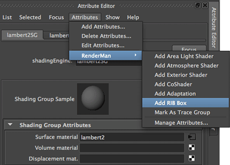Step 3 - Assigning a RIBBox in MayaAssign any material to the object to be shaded with the OSL shader. Go to the material Shading Group and add a RIB Box.