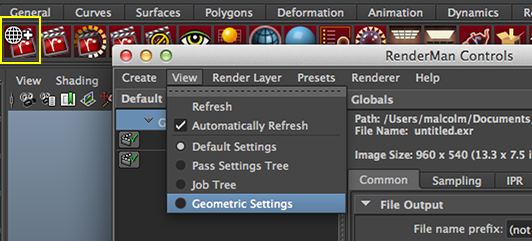 Using the NodeBecause the node writes data to a pointcloud it is necessary to assign three attributes to the geometry that will change color when they collide with other objects. Also, a display channel must be declared. For some background information about display channels refer to the RSL: AOVs - Secondary Images tutorial. Step 1 - Adding the Baking AttributesOpen the RenderMan Controls window and change the View to "Geometric Settings" figure 1.
